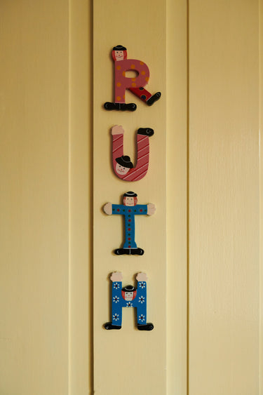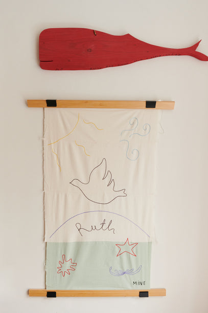 Gifts made with love: Ruth's name embroidered on fabric by artist Mine Burchkin. Above the fabric hangs a red whale, also made by hand and given to Ruth on her first birthday.