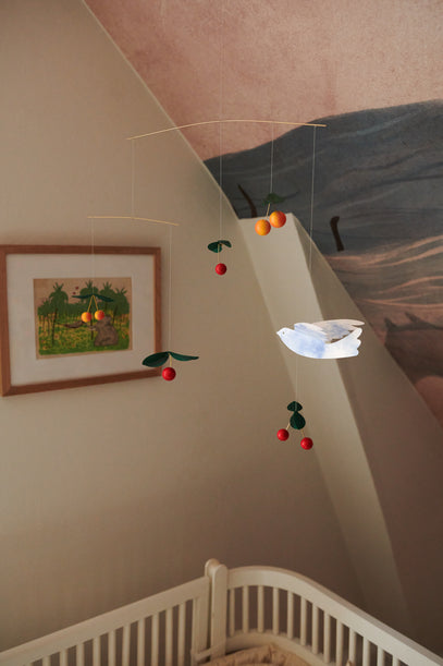 The handmade Cherry Birds Mobile from Flensted Mobiles is placed over Ruth's crib, and is a beautiful addition to the room with its wooden, red cherries and the blue bird made from folded paper.
