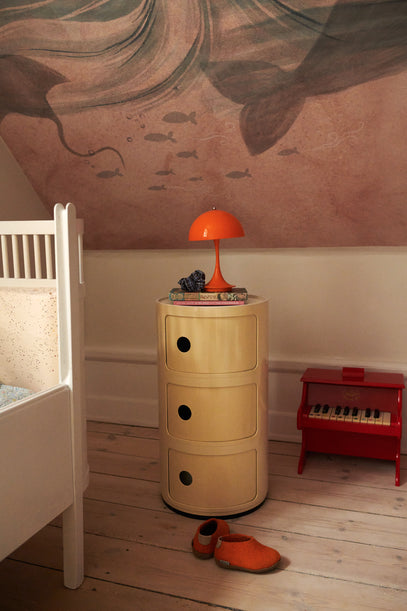A vintage Kartell piece is used for storage as well as a bed side table, holding an orange-coloured Mini Panthella Lamp and some favourite books for night time. Next to it, on the floor, is a Red Mini Piano.