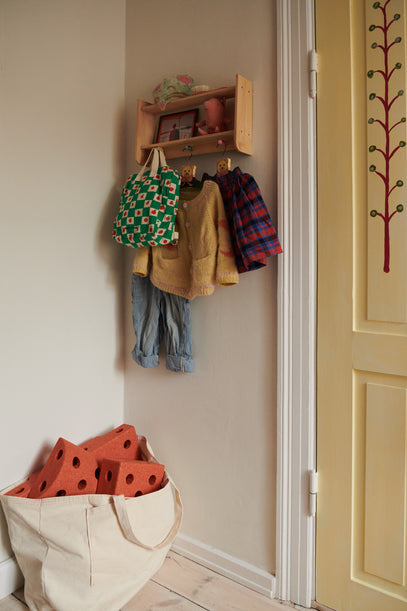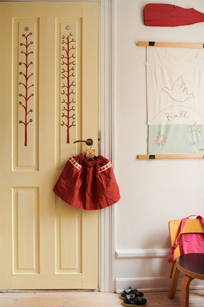 Hand painted details on the door is a work in progress by Ruth's mom Freja. Also seen here: A Pockets Skirt on the door, ready for summer alongside the Surfer Sandals on the floor. The Alvar Aalto chair is found vintage, and the embroidered name piece on the wall is a gift to Ruth from friends, produced by embroidery artist Mine Burckin.