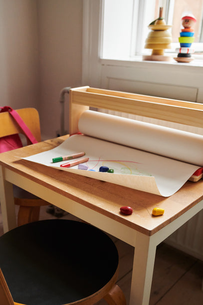The little table invites to creativity with a practical paper roll from IKEA, and crayons from Skovalfen.