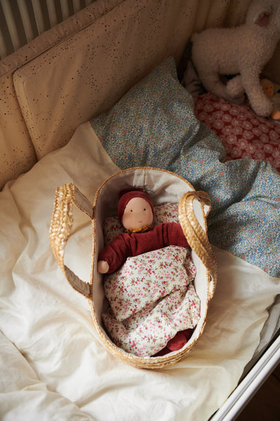 A doll sits in Ruth's bed, ready to sleep in her own little cosy rattan basket. Bedding is from Teira 1996, and a similar doll may be found here.