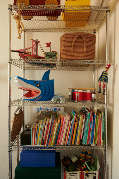 A classic Metro shelf is used to store books and various toys. Seen here: An open raffia basket colour 'Tea'; the book 'Den Fantastiske Bus' and Kohlrabi swim shorts.