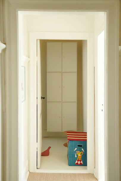 A look into the hallway just outside Valdemar's room, where Montana cabinets are used to store his clothes. On the floor: A flat-lid large Rice basket.