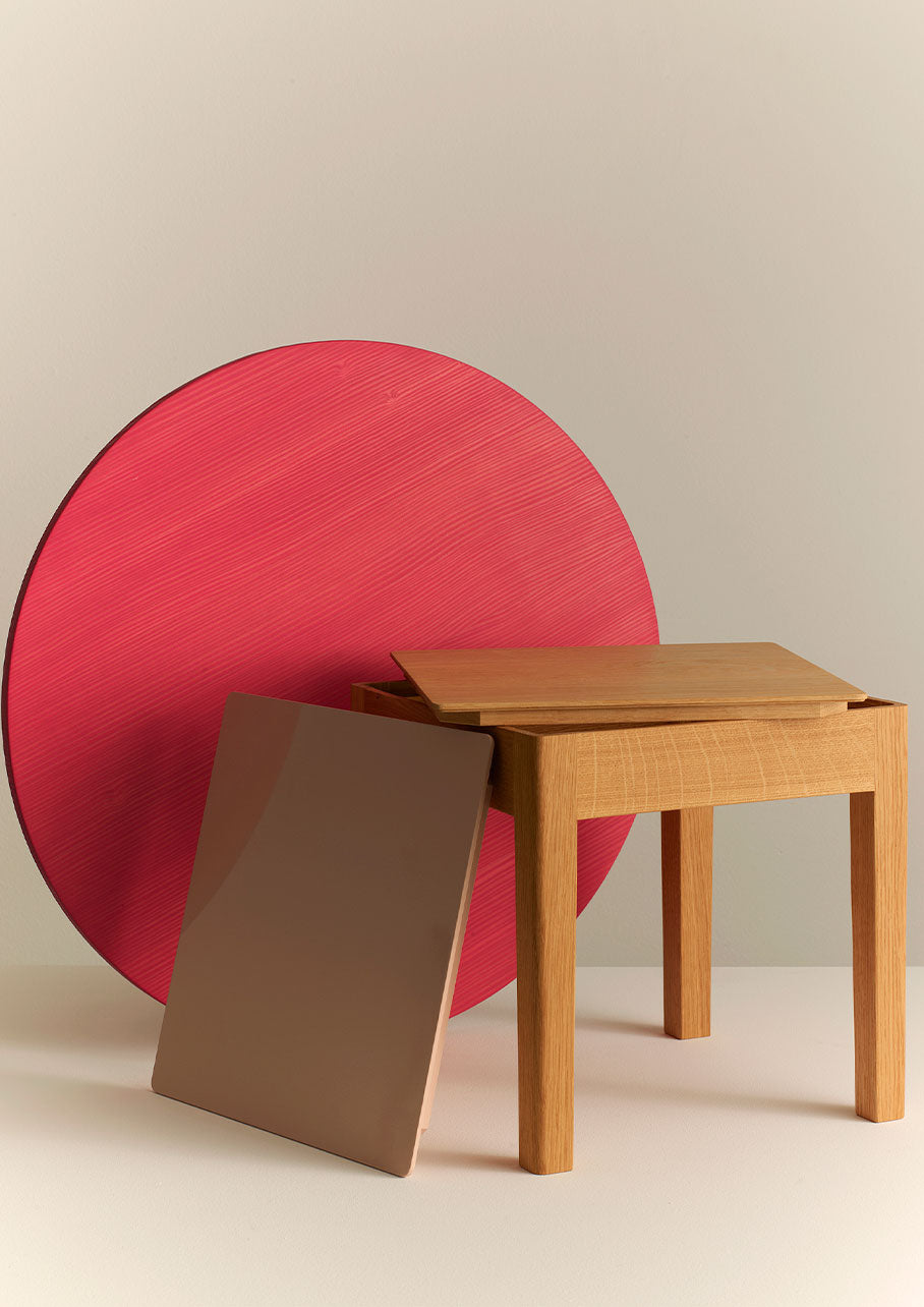 The frame is made from Danish oil-treated oak, while the seat/top is made of painted plywood with a glossy finish. The vibrant and fluorescent hues are obtained by a custom mix of colour and multiple layers of clear coat.
