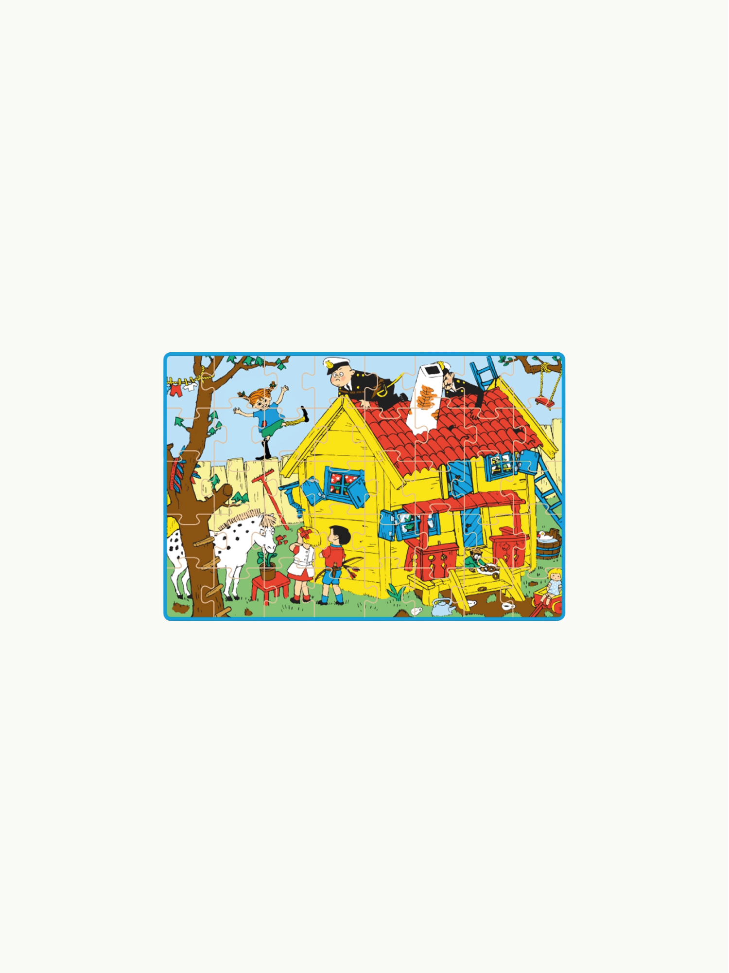 Tucked inside a sturdy suitcase is a puzzle that brings to life the playful antics of Pippi Longstocking, right in the heart of her whimsical adventures. This puzzle is not just a fun activity but also a piece of nostalgia for those who grew up with Astrid Lindgren's beloved stories.