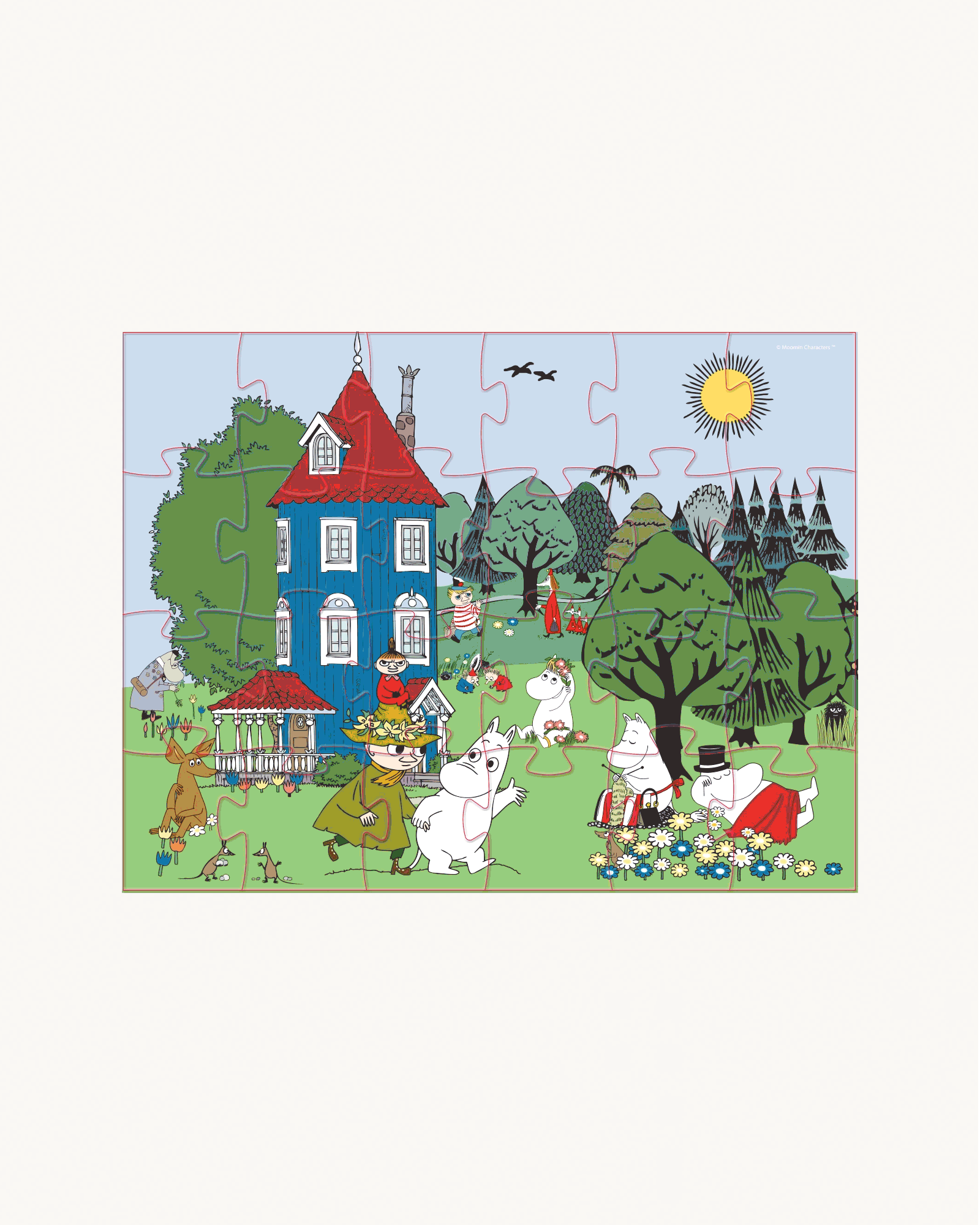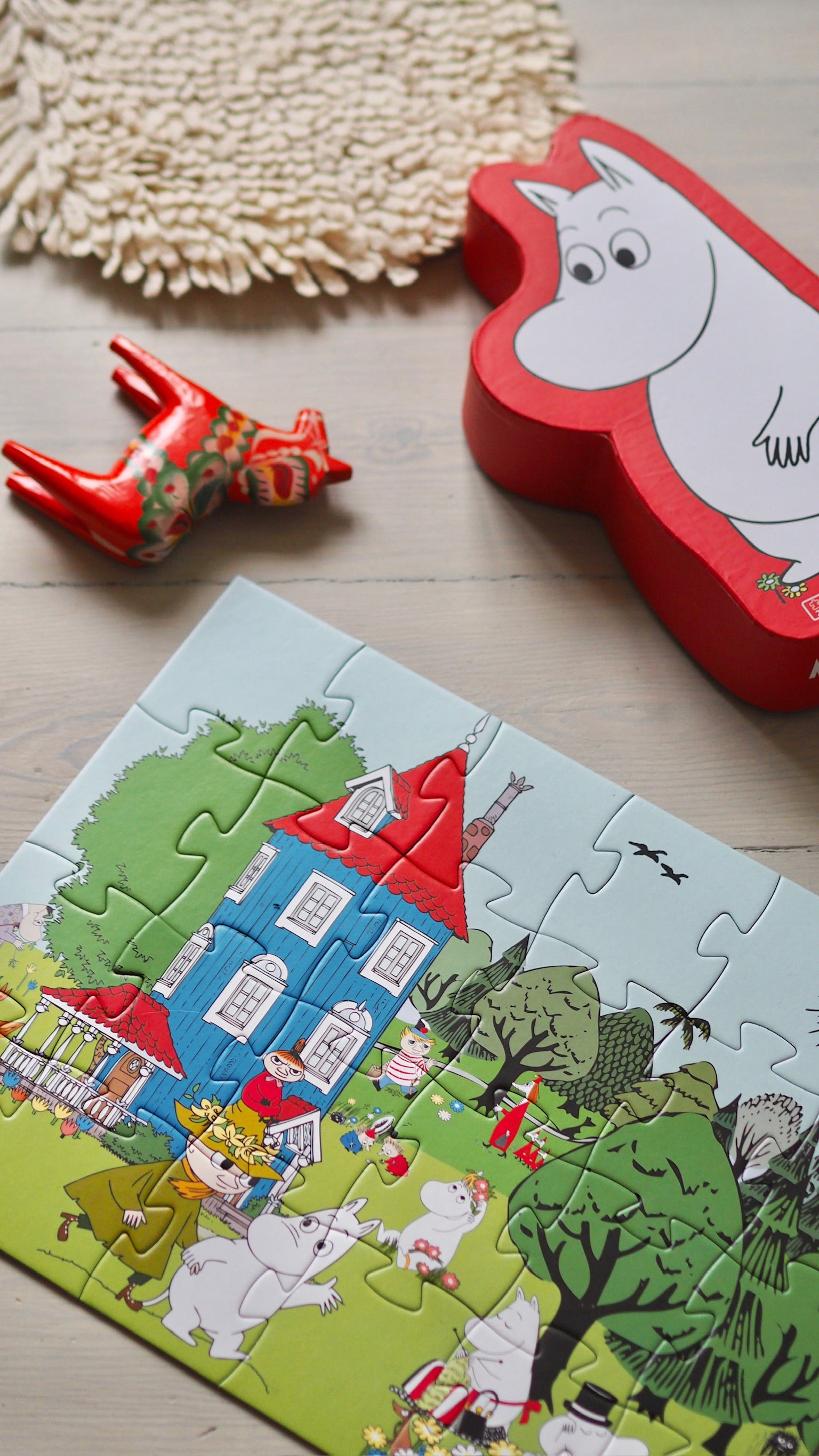 A lovely Moomin puzzle featuring the Moomins in their valley in front of the Moomin House. The puzzle comes in a decorative Moomin-shaped box.