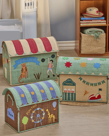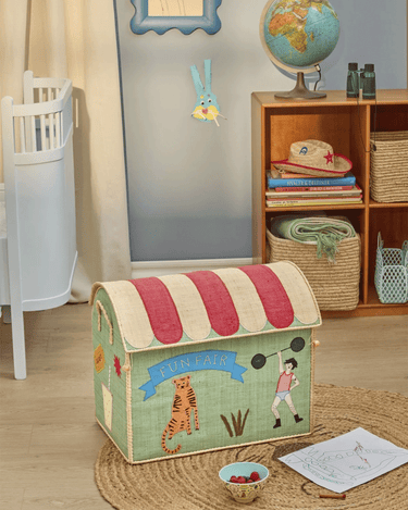 The Raffia Fun Fair Basket is a lovely, embroidered, handmade and practical storage basket.